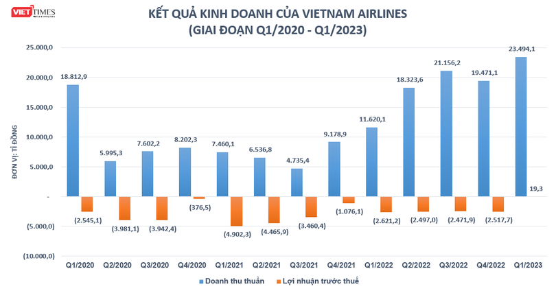Kết quả, Vietnam Airlines ghi nhận lợi nhuận trước thuế quý 1/2023 đạt 19,3 tỉ đồng, trong khi cùng kỳ năm trước lỗ tới 2.621,2 tỉ đồng, qua đó ngắt mạch thua lỗ 12 quý liên tiếp kéo dài từ quý 1/2020. Tuy nhiên, doanh nghiệp hàng không này vẫn lỗ sau thuế 37,3 tỉ đồng