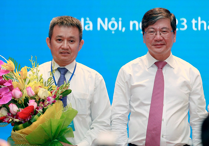 Ông Phạm Ngọc Minh thay mặt HĐQT chúc mừng Ông Dương Trí Thành (bên trái) trúng cử vào HĐQT và được bổ nhiệm là TGĐ TCT HKVN tại phiên họp lần 1 của HĐQT.