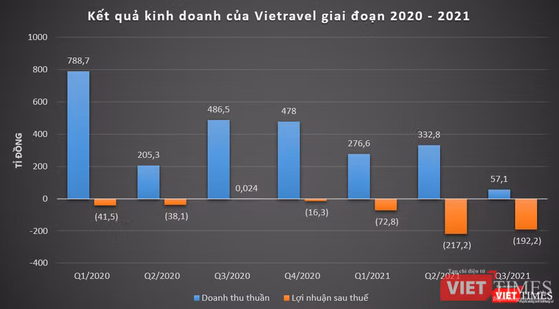 Trong quý 3/2021, Vietravel ghi nhận doanh thu thuần đạt 57,1 tỉ đồng, giảm 88% so với cùng kỳ năm trước. Kinh doanh dưới giá vốn, công ty này báo lỗ gộp 119 tỉ đồng, trong khi cùng kỳ năm trước báo lãi 65,3 tỉ đồng.
