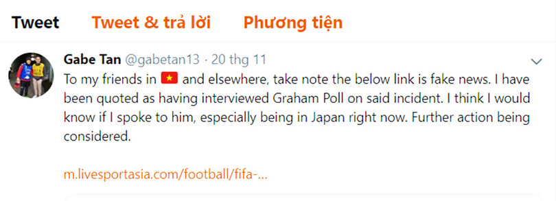Tuy nhiên, đến tối ngày 20/11, phóng viên Gabriel Tan đã đính chính thông tin trên trang Twitter cá nhân. Ông Tan tweet rằng: “Gửi đến các bạn ở Việt Nam và những nơi khác, hãy lưu ý là link dưới đây là tin sai sự thực. Tôi đã bị trích dẫn rằng có cuộc phỏng vấn trọng tài Graham Poll về tình huống này. Nếu tôi phỏng vấn ông ấy tôi phải biết chứ, trong khi tôi lại đang đi du lịch ở Nhật. Tôi đang xem xét các hành động tiếp theo”. Ông Gabriel Tan sau đó đã gắn đường link của livesportasia.com dưới bài tweet của mình.