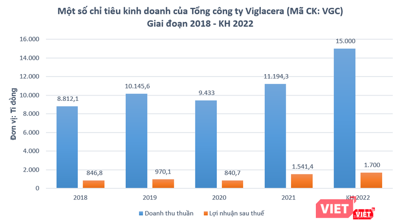 Cụ thể, Viglacera đặt mục tiêu doanh thu hợp nhất năm 2022 đạt 15.000 tỉ đồng và lợi nhuận trước thuế đạt 1.700 tỉ đồng, tăng lần lượt 34% và 10% so với thực hiện năm 2021.