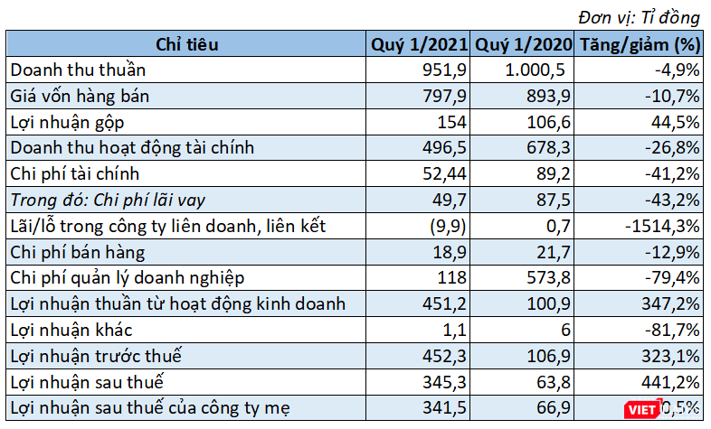 Kết Quý 1/2021, Vinaconex vẫn báo lãi sau thuế 345,3 tỉ đồng, gấp 5,4 lần so với Quý 1/2020. Lợi nhuận sau thuế của công ty mẹ đạt 341,5 tỉ đồng.