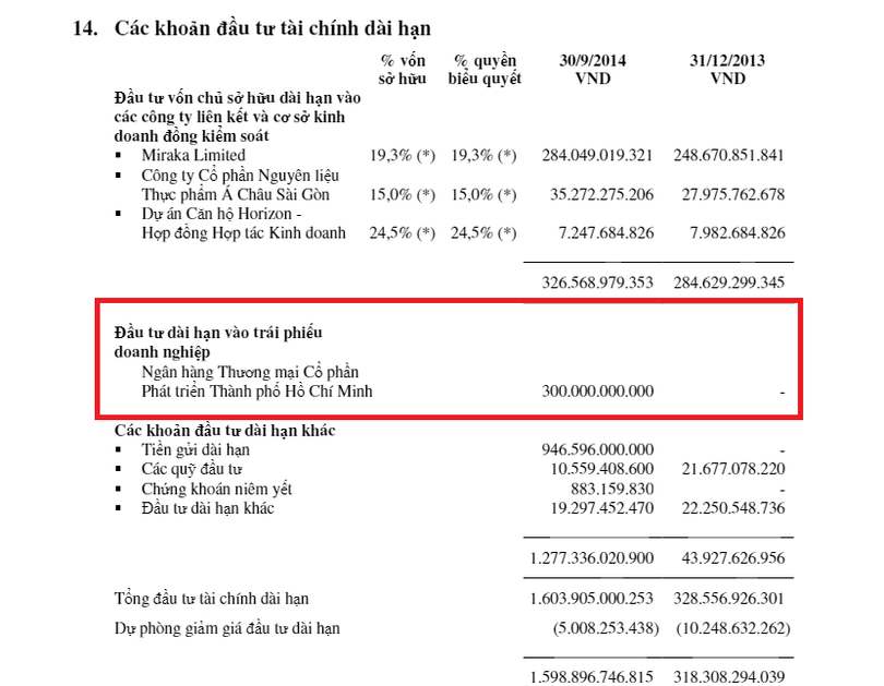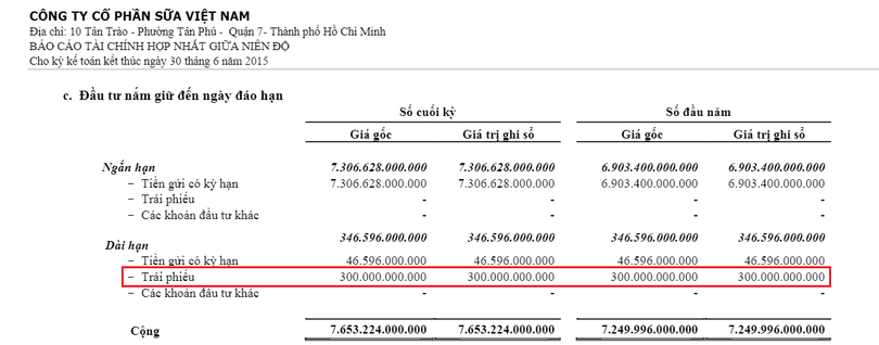Khoản đầu tư dài hạn trái phiếu HDBank sau đó được duy trì ổn định và giữ nguyên ở mức 300 tỷ đồng cho tới thời điểm hiện tại, mặc dù chi tiết “Ngân hàng TMCP Phát triển Thành phố Hồ Chí Minh” thì đã được ẩn đi và các thuyết minh cũng chỉ còn đề cập tới hai từ “trái phiếu”.