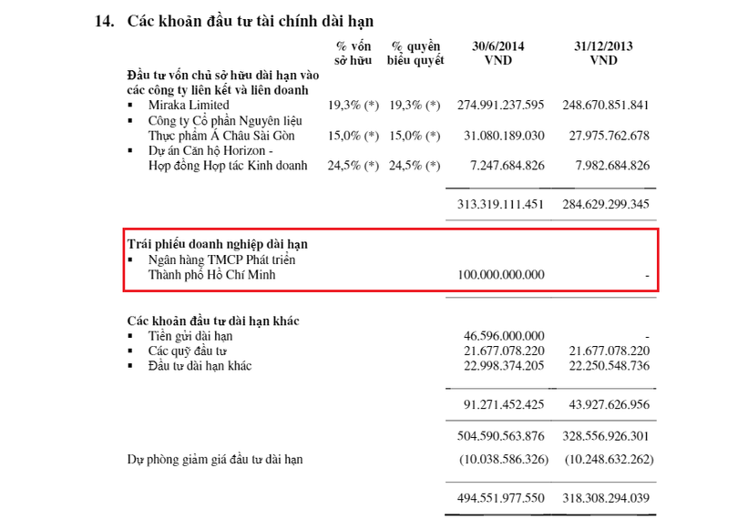Khoản đầu tư trái phiếu HDBank của Vinamilk bắt đầu được ghi nhận từ BCTC bán niên năm 2014