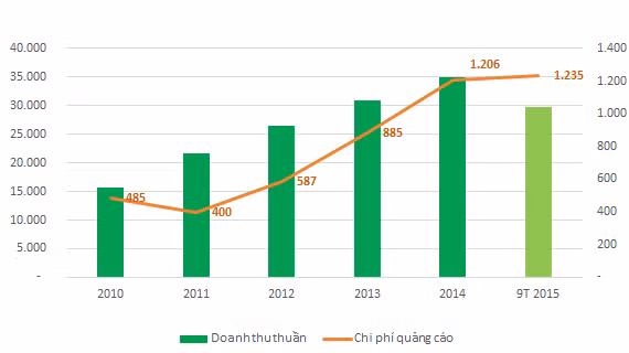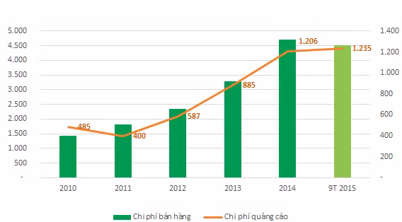 Rõ ràng, chi phí quảng cáo 9 tháng đầu năm 2015 của Vinamilk biến động đặc biệt, cao hơn mức chi cả năm 2014. Kết quả mang lại, doanh thu của công ty 9 tháng đầu năm 2015 đạt 85% con số cả năm 2014. Hãy chờ kết quả doanh thu chính thức năm 2015 để biết hiệu quả mà chi phí quảng cáo mang lại.