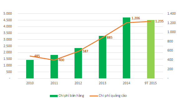 Chi phí bán hàng Vinamilk bỏ ra trong 9 tháng đầu năm đạt 4.506 tỷ đồng, tăng 77,2% so với cùng kỳ. Trong hơn 4.500 tỷ đồng chi phí bán hàng, có tới 1.235 tỷ đồng là chi phí quảng cáo, cũng tăng với tỷ lệ 77,2% so với cùng kỳ.