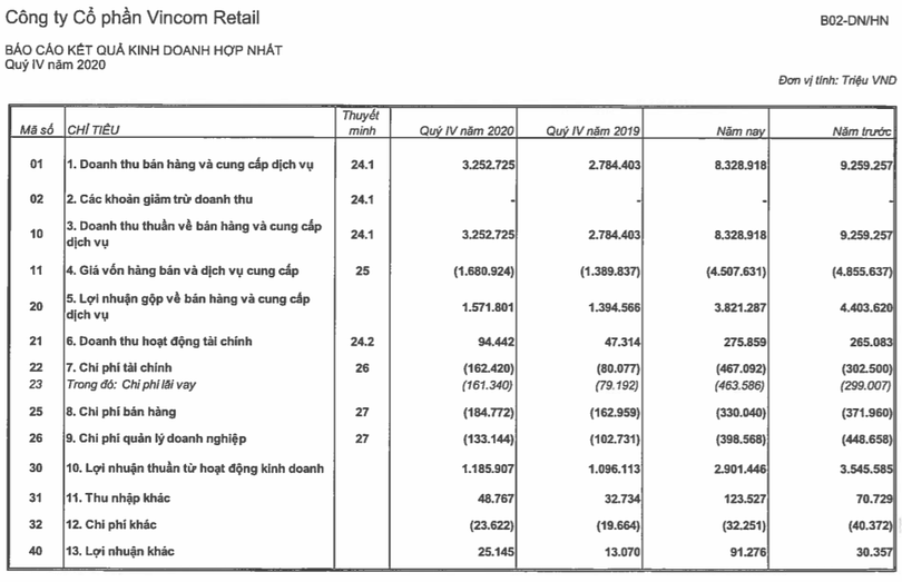 Lợi nhuận sau thuế hợp nhất Quý 4/2020 của Vincom Retail đạt 975 tỉ đồng, tăng 10,3% so với cùng kỳ năm trước và tăng 70,3% so với quý trước.