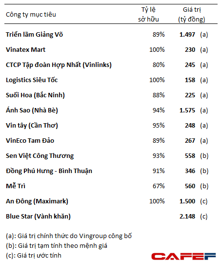 Trong năm 2015, mặc dù chưa có số liệu đầy đủ nhưng theo ước tính của CafeF, tổng giá trị của các thương vụ M&A mà hệ thống Vingroup đã thực hiện cũng không dưới 10.000 tỷ đồng. Như vậy chỉ trong 2 năm, Vingroup đã chi ra khoảng 20.000 tỷ, tương đương gần 1 tỷ USD để mở rộng hệ thống của mình.