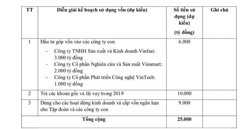 Số tiền huy động được dự kiến sẽ dùng 6.000 tỷ đồng để đầu tư cho các công ty con trong lĩnh vực công nghiệp - công nghệ là VinFast, Vinsmart và VinTech; 10.000 tỷ đồng trả nợ gốc và lãi; 9.000 tỷ đồng còn bổ sung vốn cho tập đoàn và các công ty con.