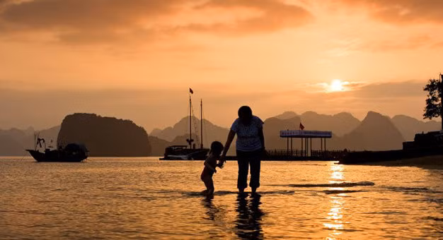 Khi mặt trời chiếu những tia nắng cuối ngày lên làn nước trong xanh, vịnh Hạ Long khoác lên mình một vẻ đẹp lung linh đến huyền diệu. Sắc màu của thiên nhiên vẽ nên một tuyệt tác nghệ thuật, dựng lên phông nền hoàn hảo cho bức ảnh của bạn.