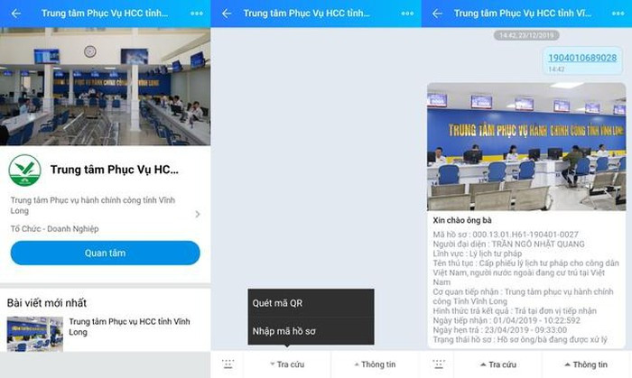 Sau khi quan tâm Zalo “Trung tâm Phục vụ HCC tỉnh Vĩnh Long”, công dân cung cấp số điện thoại cho công chức tiếp nhận hồ sơ. Thông qua số điện thoại này, Trung tâm Phục vụ HCC tỉnh Vĩnh Long sẽ gửi tin nhắn về việc tiếp nhận hồ sơ, lệ phí, giấy hẹn trả kết quả.