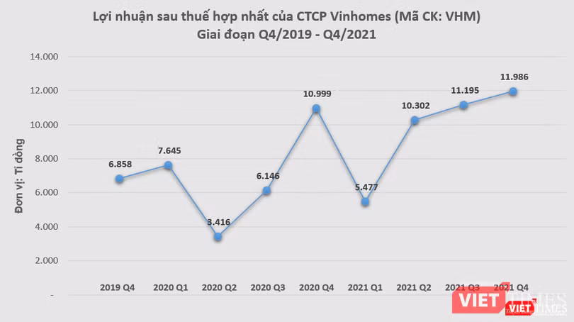 Trừ đi chi phí, VHM báo lãi sau thuế quý 4/2021 đạt 11.986 tỉ đồng, tăng 9% so với cùng kỳ năm trước. Lũy kế cả năm 2021, lợi nhuận sau thuế của VHM đạt 39.231 tỉ đồng, tăng trưởng 39%.