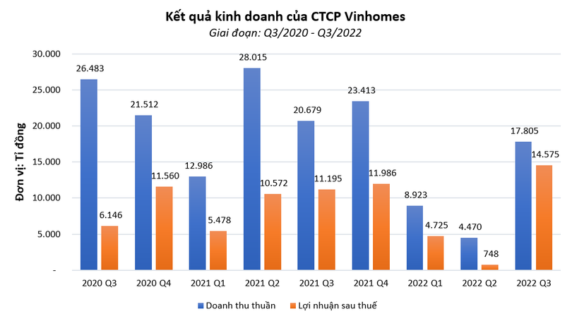 Luỹ kế 9 tháng đầu năm 2022, doanh thu thuần và lợi nhuận trước thuế của VHM lần lượt đạt 31.198 tỉ đồng và 26.193 tỉ đồng, tương ứng mức giảm lần lượt 49,4% và 23,7% so với cùng kỳ năm 2021. Trừ đi chi phí thuế thu nhập doanh nghiệp, VHM báo lãi sau thuế 20.048 tỉ đồng trong 9 tháng đầu năm 2022.