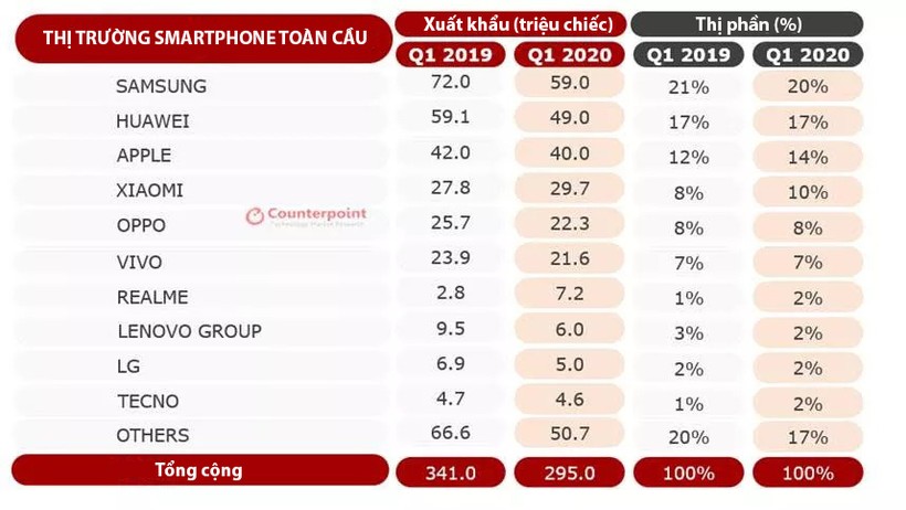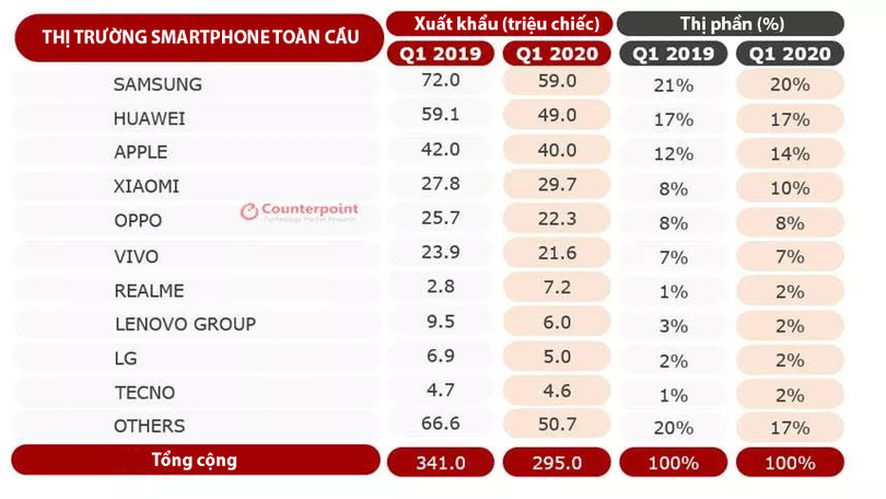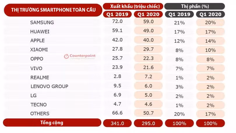 Bảng thống kê của Counterpoint Research cho thấy Samsung, Huawei và Apple vẫn là 3 nhà cung cấp hàng đầu. Apple cho thấy mức sụt giảm nhỏ của các lô hàng tính theo năm. Xiaomi đứng vị trí thứ tư, lần đầu tiên chiếm 10% thị phần toàn cầu.