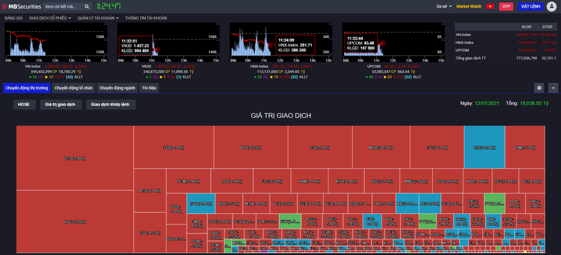 Sắc đỏ bao trùm toàn thị trường với số mã giảm điểm chiếm áp đảo. Trên sàn HoSE, tính đến cuối phiên sáng có tới 377 mã giảm điểm, 12 mã tham chiếu và chỉ có 16 mã tăng. Sàn HNX có 204 mã giảm, 132 mã tham chiếu và 23 mã tăng.