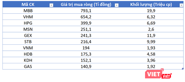 MBB là cổ phiếu đứng đầu về giá trị mua ròng của khối ngoại trong tuần qua, đạt mức 793,1 tỉ đồng. Tiếp đến là các cổ phiếu VHM (654,2 tỉ đồng), HPG (399,9 tỉ đồng), MSN (251,1 tỉ đồng) và GEX (241,3 tỉ đồng).