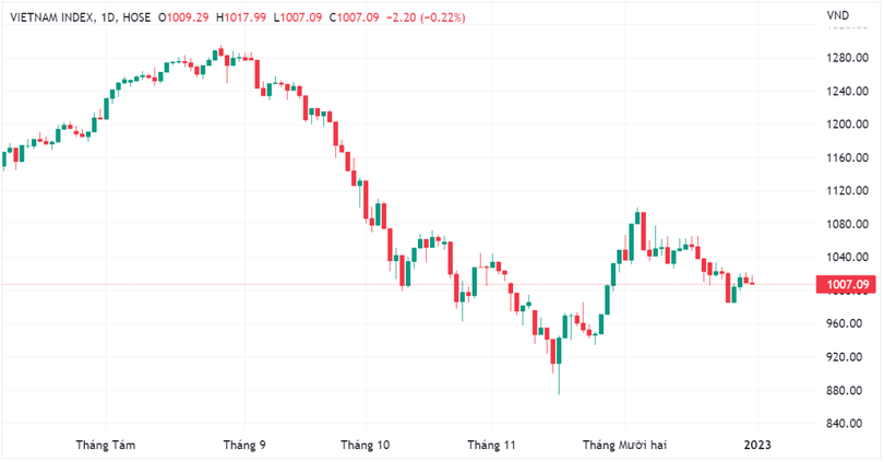 Phiên giao dịch cuối cùng của năm 2022 ngày 30/12 diễn ra đôi chút tiếc nuối khi VN-Index bất ngờ đảo chiều giảm 2,2 điểm (-0,22%), đóng cửa ở mức 1.007,09 điểm.