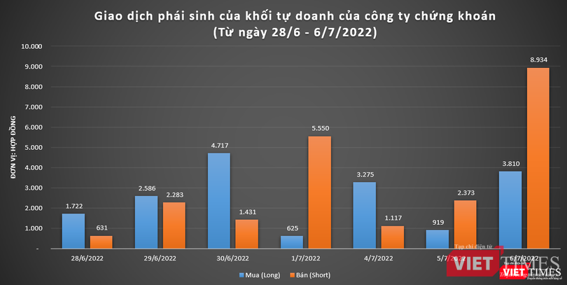 Theo tính toán của VietTimes, khối lượng giao dịch của khối tự doanh chỉ chiếm khoảng 2,2% thanh khoản của thị trường phái sinh trong phiên giao dịch ngày 6/7.
