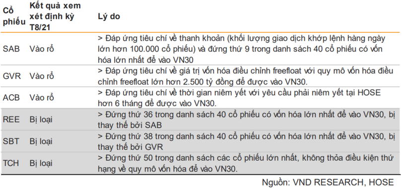 Trong khi đó, ACB của Ngân hàng TMCP Á Châu là cổ phiếu luôn đáp ứng đầy đủ các yêu cầu sàng lọc chỉ số ngoại trừ tiêu chí về thời gian niêm yết sau khi chuyển sàn từ HNX sang HOSE vào cuối năm 2020. Sau 6 tháng giao dịch trên HOSE, ACB sẽ là cổ phiếu mới của chỉ số VN30 trong giai đoạn này.