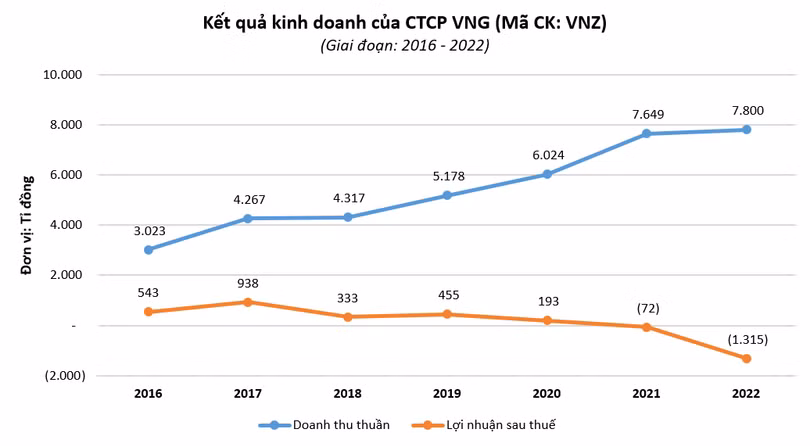 Lũy kế cả năm 2022, doanh thu thuần của VNG đạt 7.800,5 tỉ đồng, tăng 1,9% so với năm 2021; lỗ sau thuế ở mức 1.315,4 tỉ đồng.