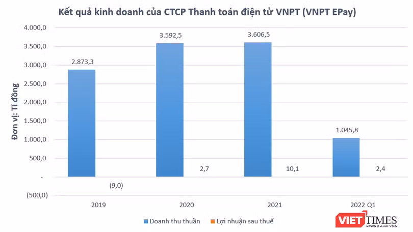 Kết thúc quý 1/2022, VNPT Epay ghi nhận doanh thu thuần đạt 1.045,9 tỉ đồng, tăng 22% so với cùng kỳ năm trước. Lợi nhuận sau thuế ở mức 2,44 tỉ đồng, tăng 64,5% so với quý 1/2021.