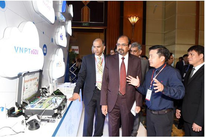 Ông Huỳnh Quang Liêm – Phó TGĐ Tập đoàn VNPT giới thiệu với ông Ravi Kant – Thứ trưởng Bộ Truyền thông Ấn Độ về các giải pháp IoT của Tập đoàn VNPT cũng như của VNPT Technology