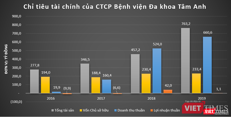 Năm ngoái, CTCP Bệnh Viện Đa Khoa Tâm Anh ghi nhận doanh thu đạt 660,6 tỷ đồng, song chỉ báo lãi vỏn vẹn 1,1 tỷ đồng. Tính đến cuối năm 2019, quy mô tổng tài sản của công ty này cũng mới chỉ đạt 763,2 tỷ đồng, trong khi nguồn vốn chủ sở hữu đạt 233,4 tỷ đồng.
