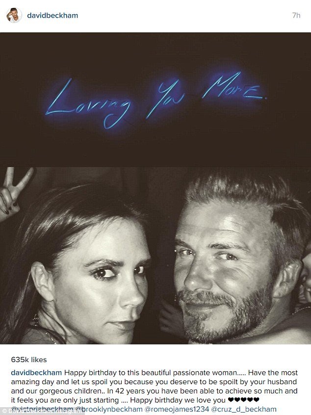Kèm theo dòng chia sẻ, David Beckham chọn bức ảnh của hai vợ chồng được chụp dưới dòng chữ “Yêu em nhiều hơn”.