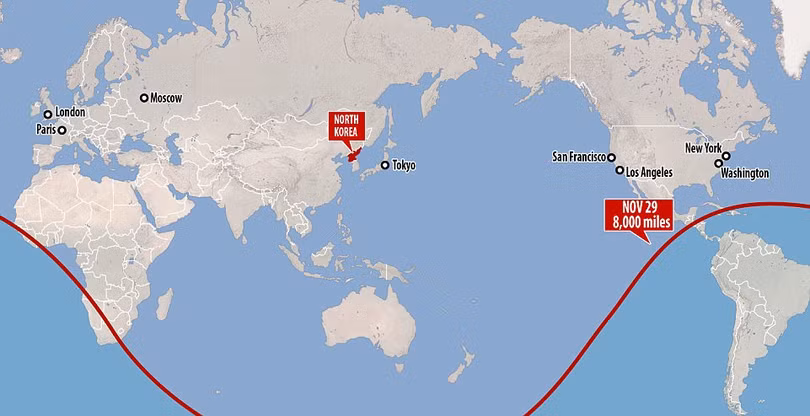 Bản đồ đánh giá khoảng cách xa nhất mà tên lửa Triều Tiên có thể tiếp cận. Hwasong-15 là tên lửa đạn đạo xuyên lục địa có thể tấn công bất cứ mục tiêu nào trên thế giới trừ Nam Phi và một số địa phương ở phía nam Châu Phi.