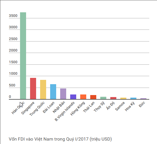 Cục Đầu tư nước ngoài (Bộ KH-ĐT) cho biết, trong 3 tháng đầu năm 2017, tổng vốn đầu tư nước ngoài FDI vào Việt Nam lên tới 7,71 tỷ USD, tăng hơn gấp đôi so với con số 3,4 tỷ USD trong 2 tháng đầu năm và tăng 91,5% so với cùng kỳ năm trước.