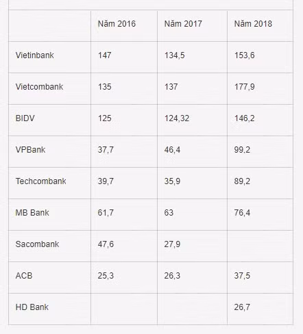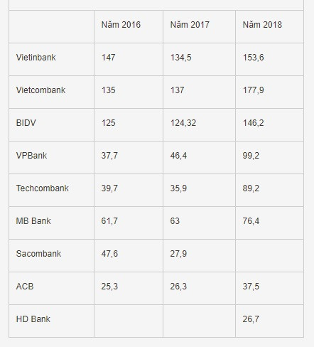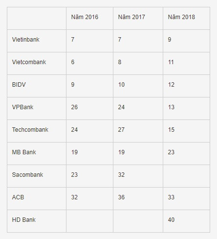 Bảng xếp hạng thương hiệu các ngân hàng lọt vào danh sách 40 thương hiệu giá trị lớn nhất Việt Nam 2018 qua các năm