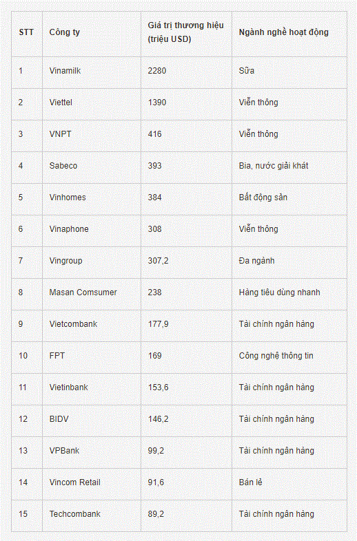 Bảng xếp hạng 15 công ty có giá trị thương hiệu đắt giá nhất Việt Nam năm 2018