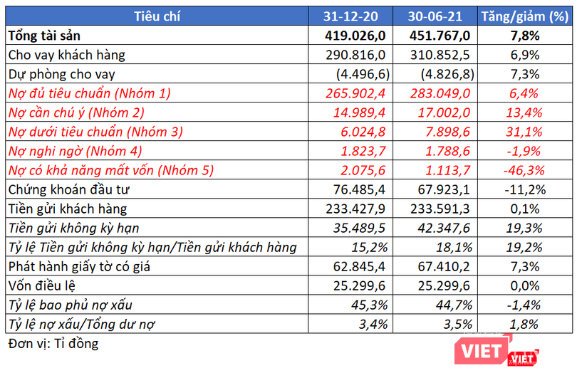 Dư nợ cho vay khách hàng đạt 310.852,5 tỉ đồng, chiếm 68,8% tổng tài sản, tăng trưởng 6,9%.