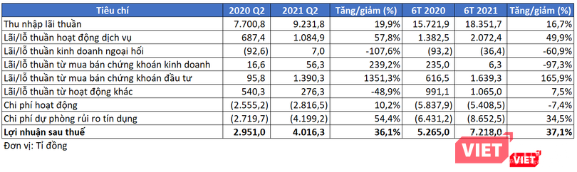 Trong đó, thu nhập lãi thuần của VPBank trong kỳ đạt 9.231,8 tỉ đồng, tăng 19,9% so với cùng kỳ năm 2020. Lãi từ mua bán chứng khoán đầu tư đạt 1.390,3 tỉ đồng, tăng 13 lần so với cùng kỳ năm trước. Hoạt động dịch vụ cũng đem về cho VPBank khoản lãi 1.084,9 tỉ đồng trong quý 2/2021, tăng gấp rưỡi so với cùng kỳ năm trước.Động lực cho đà tăng trưởng lợi nhuận quý 2/2021 của VPBank chủ yếu đến từ thu nhập lãi thuần, hoạt động dịch vụ và lãi từ mua bán chứng khoán đầu tư.