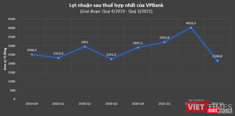 Luỹ kế 9 tháng đầu năm 2021, nhà băng này báo lãi hợp nhất trước thuế 11.735,7 tỉ đồng, tăng 24,8% so với cùng kỳ năm trước. Lợi nhuận sau thuế hợp nhất của VPBank đạt 9.378,9 tỉ đồng, tăng 24,7% so với 9 tháng đầu năm 2020.