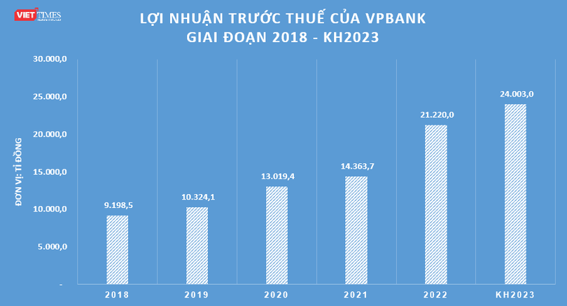 Cụ thể, ban lãnh đạo VPBank dự trình cổ đông xem xét thông qua mục tiêu lợi nhuận trước thuế năm 2023 ở mức 24.003 tỉ đồng, tăng 13% so với kết quả đạt được năm 2022.