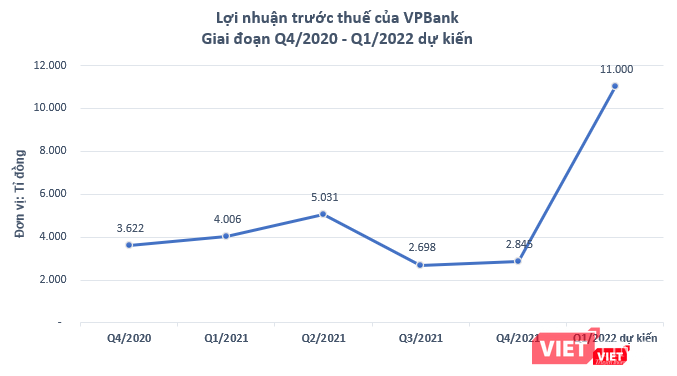 Truyền thông trong nước dẫn nguồn tin từ lãnh đạo VPBank cho biết, lợi nhuận trước thuế hợp nhất quý 1/2022 của ngân hàng này có thể đạt hơn 11.000 tỉ đồng, mức tăng trưởng rất cao so với quý liền trước và cùng kỳ năm 2021.