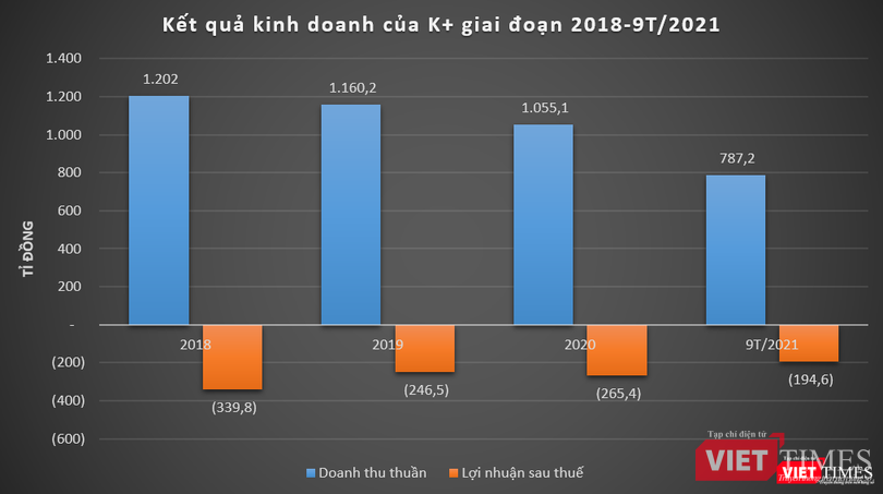 Tính đến cuối quý 3/2021, lỗ lũy kế của K+ là hơn 3.747 tỉ đồng; trong khi vốn chủ sở hữu ở mức âm 3.403 tỉ đồng.