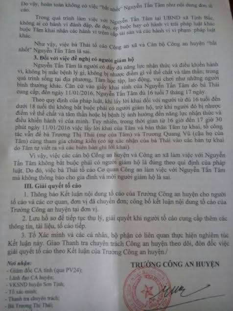 Công an huyện Sơn Tịnh (tỉnh Quảng Ngãi) vừa có kết luận đối với nội dung tố cáo của bà Trương Thị Thái (ngụ xã Tịnh Bắc, huyện Sơn Tịnh). Bà Thái tố cáo 4 cán bộ công an có hành vi “bắt nhốt” con trai bà là N.T.T. (SN 1999) mà không thông báo cho gia đình trong ngày 11-1-2016 dẫn đến cái chết đau lòng của T. hai ngày sau đó.