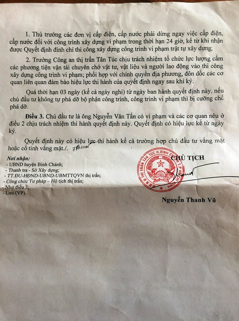 Đáng lưu ý, lý do dừng cưỡng chế, theo UBND huyện Bình Chánh là do yêu cầu cắt điện nước trong quyết định của UBND thị trấn Tân Túc chưa ổn. Điều này cũng được Bí thư huyện ủy huyện Bình Chánh xác nhận.