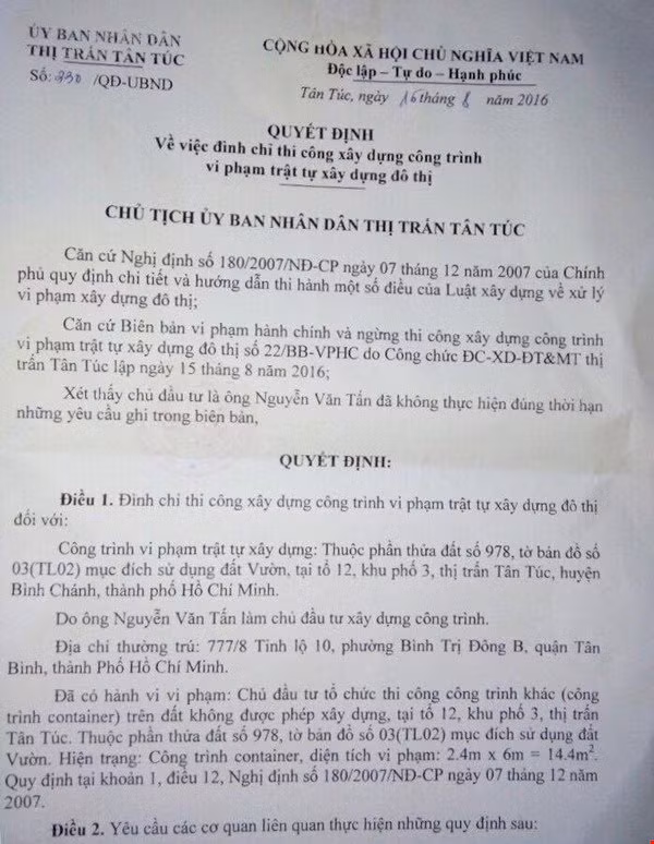 Mặt khác, có thể thấy ngay, căn cứ ra quyết định của UBND thị trấn Tân Túc là Nghị định 180/2007/NĐ-CP ngày 7/12/2007 của Chính phủ hướng dẫn thi hành Luật xây dựng. Tuy nhiên, đây là nghị định hướng dẫn thi hành Luật Xây dựng được quốc hội thông qua năm 2003.