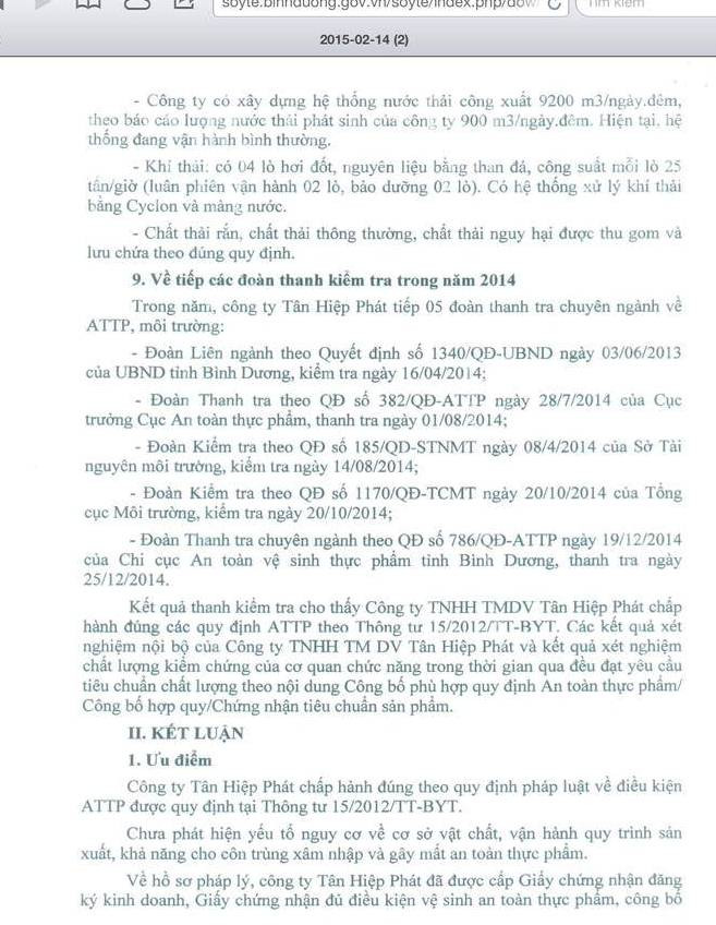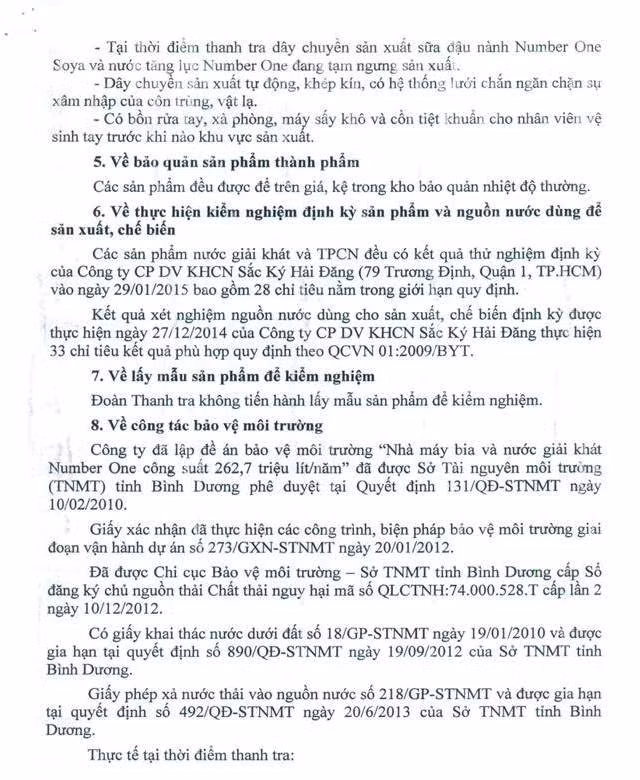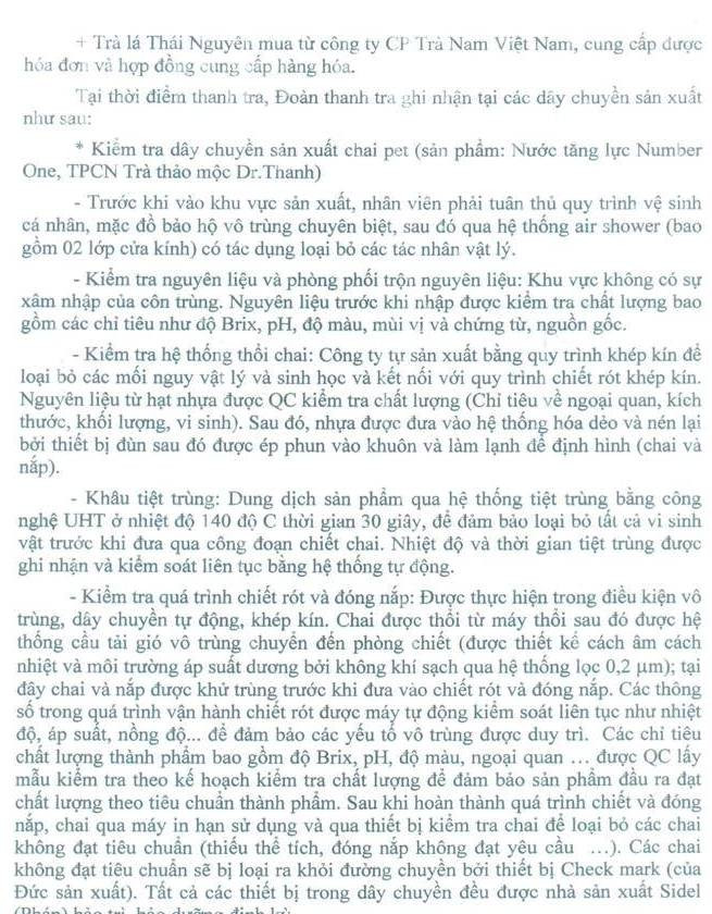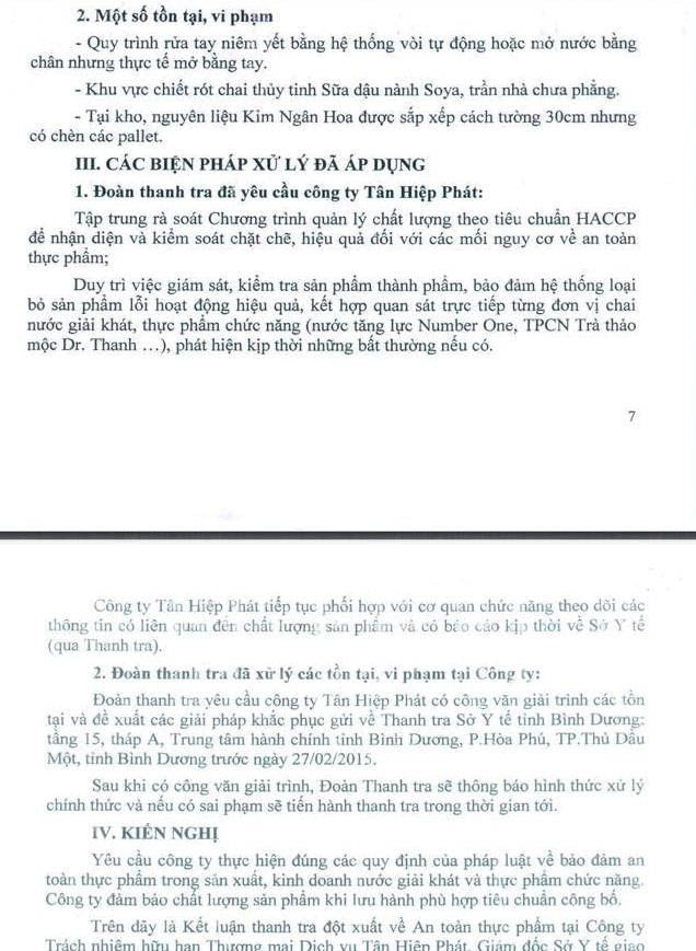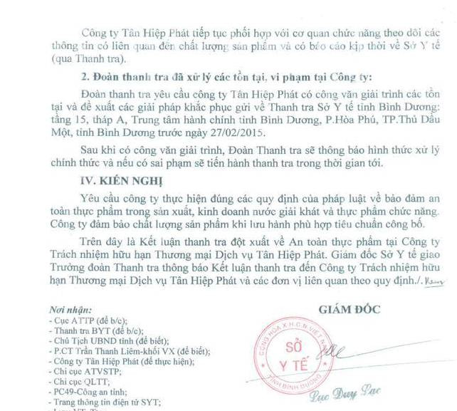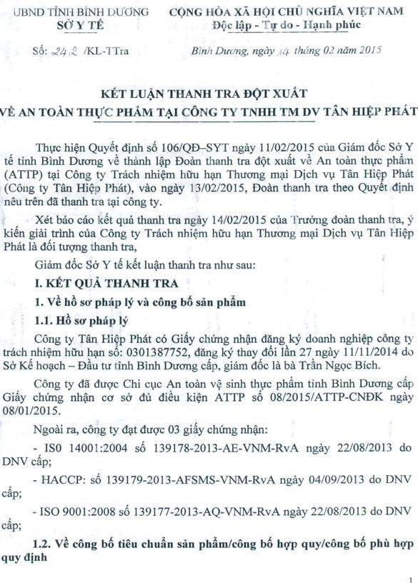 Theo kết luận thanh tra, Công ty Tân Hiệp Phát chấp hành đúng theo quy định pháp luật về điều kiện an toàn thực phẩm được quy định tại Thông tư 15/2012/TT-BYT.