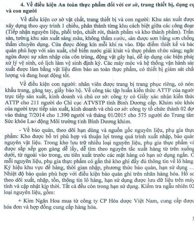 Ngay sau buổi công bố quyết định kiểm tra, đoàn đã tiến hành kiểm tra đối với 4 dây chuyền sản xuất của công ty, nguyên liệu sản xuất. Tuy nhiên, đoàn đã hoàn thành vượt mức kế hoạch đề ra khi chỉ mất một ngày đã đưa ra được kết luận thanh tra.
