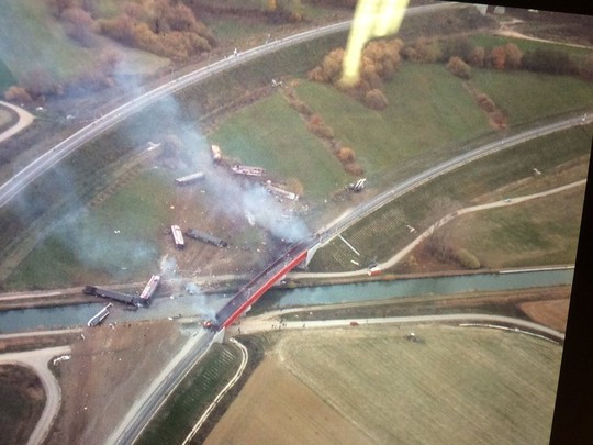 Một số toa tàu rơi xuống dòng kênh Marne-Rhine và bốc khói. Ảnh: Reuters, Twitter
