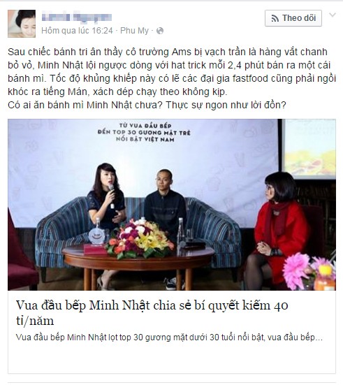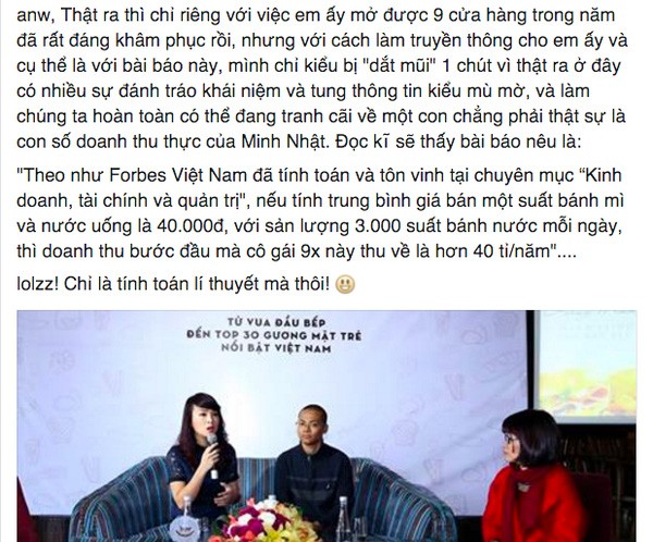 Cụ thể, bài báo viết:"Theo như Forbes Việt Nam đã tính toán và tôn vinh tại chuyên mục "Kinh doanh, tài chính và quản trị", nếu tính trung bình giá bán một suất bánh mì và nước uống là 40.000đ, với sản lượng 3.000 suất bánh nước mỗi ngày, thì bước đầu cô gái 9x này thu về hơn 40 tỉ/năm". Ngay lập tức, đây đã trở thành chủ đề gây tranh cãi của cư dân mạng.