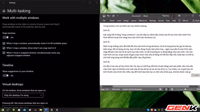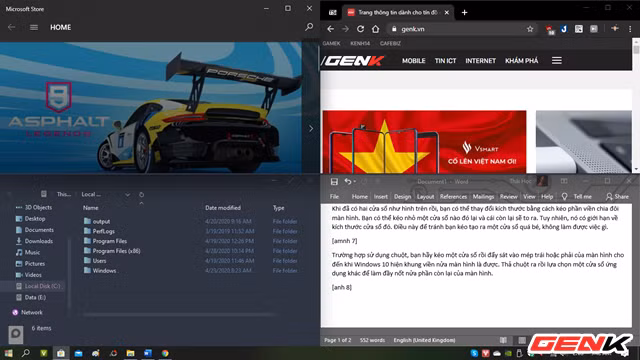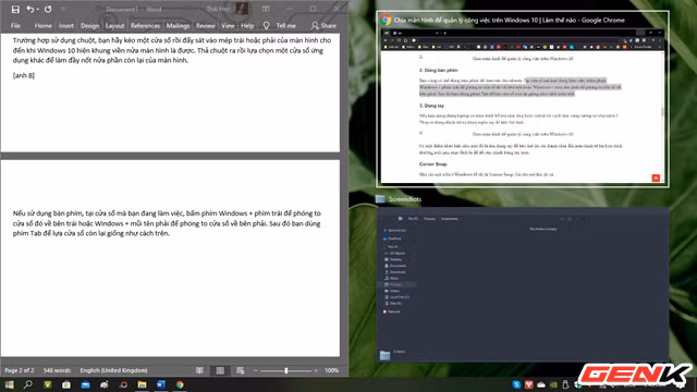 Nếu sử dụng bàn phím, tại cửa sổ mà bạn đang làm việc, bấm phím Windows + phím trái để phóng to cửa sổ đó về bên trái hoặc Windows + mũi tên phải để phóng to cửa sổ về bên phải. Sau đó bạn dùng phím Tab để lựa cửa sổ còn lại giống như cách trên.