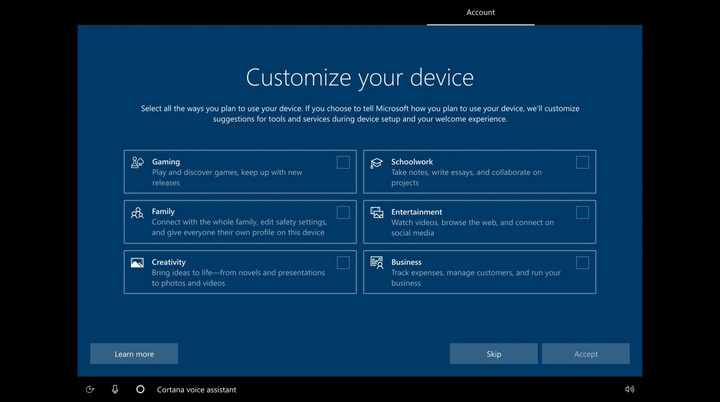 Trong bản Windows 10 Insider Preview Build 20231 mới nhất, Microsoft đã giới thiệu bước thiết lập Windows (OOBE) mới, cho phép người dùng tùy chỉnh hệ thống dựa trên mục đích định sử dụng thiết bị. Microsoft không nêu chi tiết chính xác từng tùy chọn đòi hỏi gì nhưng rất có thể sẽ hiển thị các ứng dụng, cài đặt và tính năng liên quan đến lựa chọn được đưa ra trong đó. Có thể thấy một số tùy chọn như setup máy để phục vụ chơi game, hoạt động sáng tạo, giải trí, công việc, học tập hay phục vụ gia đình.