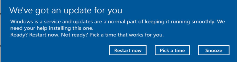 Khi khởi động lại máy, người dùng sẽ được chuyển sang một màn hình với 3 tùy chọn: Restart Now (Khởi động lại ngay), Pick a Time (Chọn thời gian) hoặc Snooze (Ngủ ngắn). Màn hình này sẽ không biến mất trừ phi bạn chọn 1 trong 3 phương án nói trên.