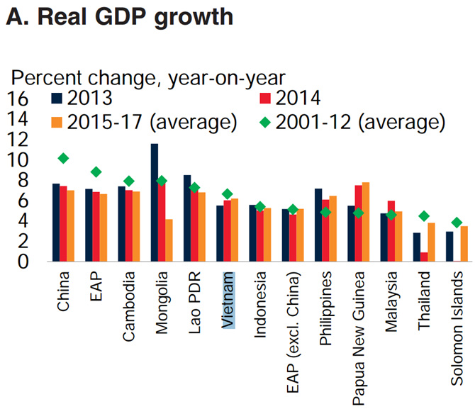 Trong báo cáo Triển vọng kinh tế toàn cầu vừa được công bố, Ngân hàng Thế giới dự đoán tăng trưởng GDP Việt Nam đạt 6% trong năm 2015, hướng tới mức tăng 6,5% trong 2 năm tới nhờ triển vọng phát triển mạnh mẽ của ngành chế tạo, xuất khẩu và đầu tư nước ngoài.
