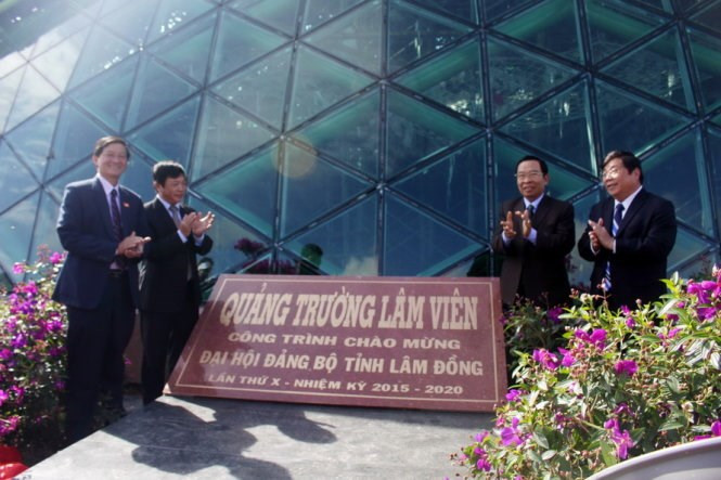 Lãnh đạo UBND tỉnh Lâm Đồng chúc mừng lễ gắn biển công trình quảng trường Lâm Viên sáng 10/10. Ảnh: C.Thành.